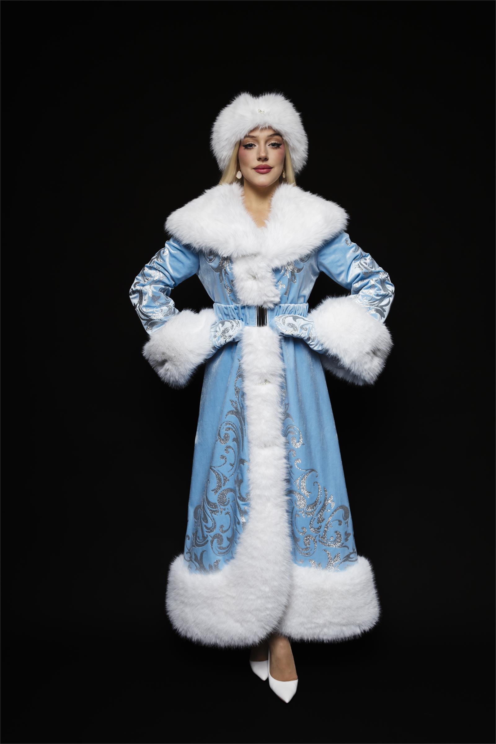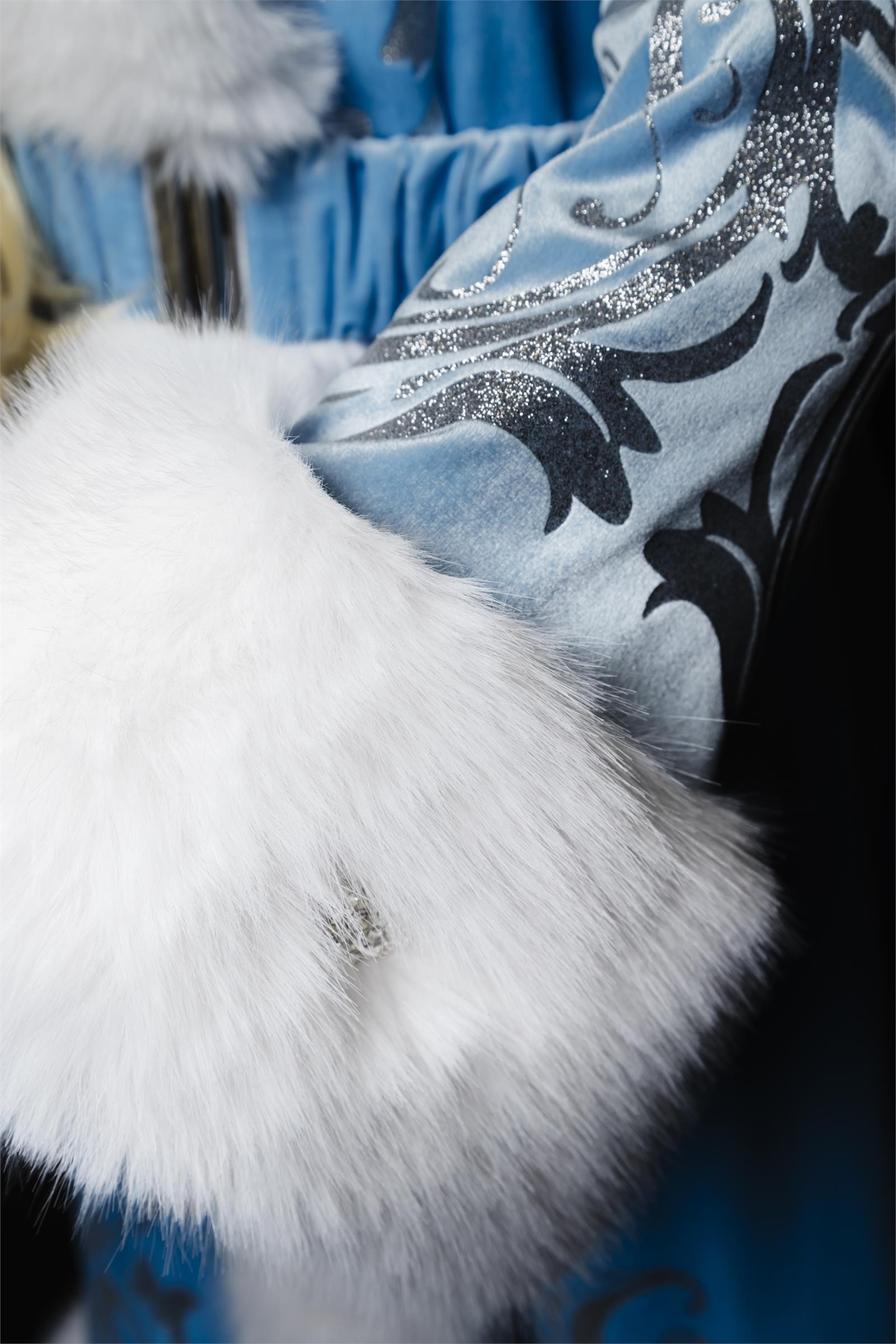 Детали: Костюм выполнен из материалов высокого качества: голубого бархата (основная ткань), белого пушистого мягкого меха (материалы сохраняют отличный внешний вид даже при интенсивной эксплуатации и после чистки). Модель костюма приталенная, с отрезной талией, с расширенным рукавом. Костюм на подкладе. Застежка супатная (скрытая) на пуговицы. На всем костюме нанесен узор. В комплект входят: шуба, шапка, варежки, пояс. Дополнительно рекомендуем приобрести – косу, кокошник. На последних фото размещена Снегурочка в кокошнике и в паре с подходящим костюмом Деда Мороза. Размеры 42, 44, 46, 48. Фото не подвергались какой-либо обработке в графических редакторах, товары, изображенные на фото, соответствуют действительности.