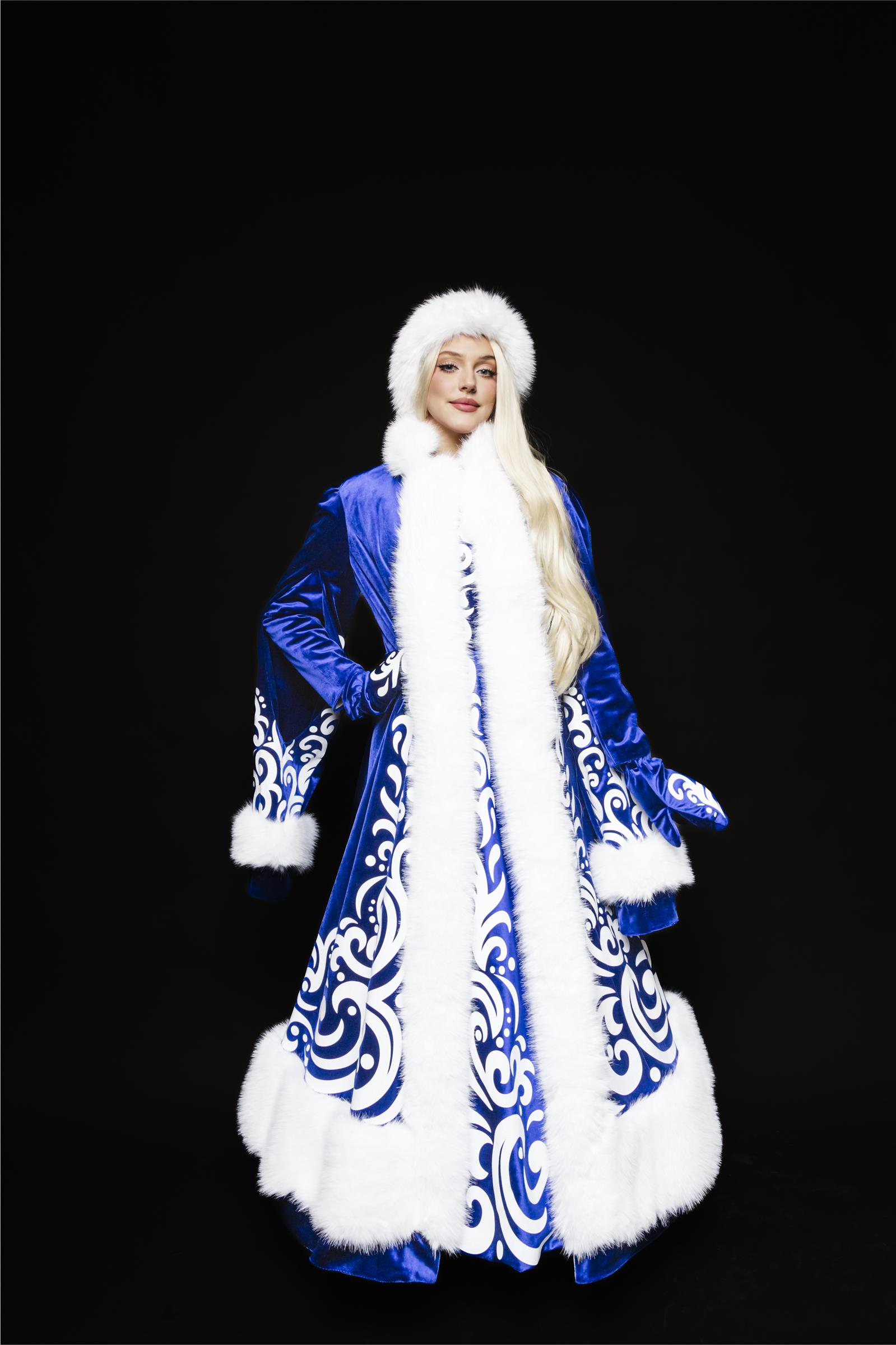 Детали: Костюм выполнен из материалов высокого качества: синего бархата (основная ткань), белого пушистого мягкого меха (материалы сохраняют отличный внешний вид даже при интенсивной эксплуатации и после чистки). В комплектность костюма входит: платье с отрезной талией, сзади застегивается на потайную молнию. Шубка распашная с длинным отлетным рукавом. Костюм на подкладе. На всем костюме нанесен белый узор, с напылением. В комплект входят: шуба, шапка, варежки, платье. Дополнительно рекомендуем приобрести – косу, кокошник. На последних фото размещена Снегурочка в кокошнике и в паре с подходящим костюмом Деда Мороза. Размеры 42, 44, 46, 48, 50. Фото не подвергались какой-либо обработке в графических редакторах, товары, изображенные на фото, соответствуют действительности.
